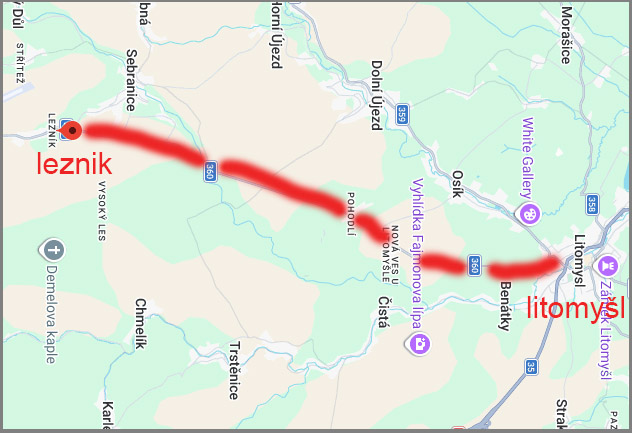 • Od konce Lezníku je do Litomyšle 14 km, z toho 2 km vedou dalšími vesnicemi.