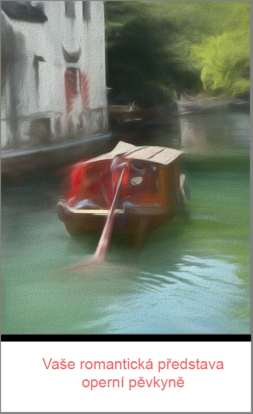 V tu chvíli jsme dostali všichni neuvěřitelný záchvat smíchu. Bylo nám jasné, že pokud je naše budoucnost v rukou zpívající lodivodky, bude velmi nejistá. Čím víc jsme si představovali, jak operním tempem kličkujeme kanály a mezitím nám ujíždí poslední spoj, tím víc jsme se smáli.